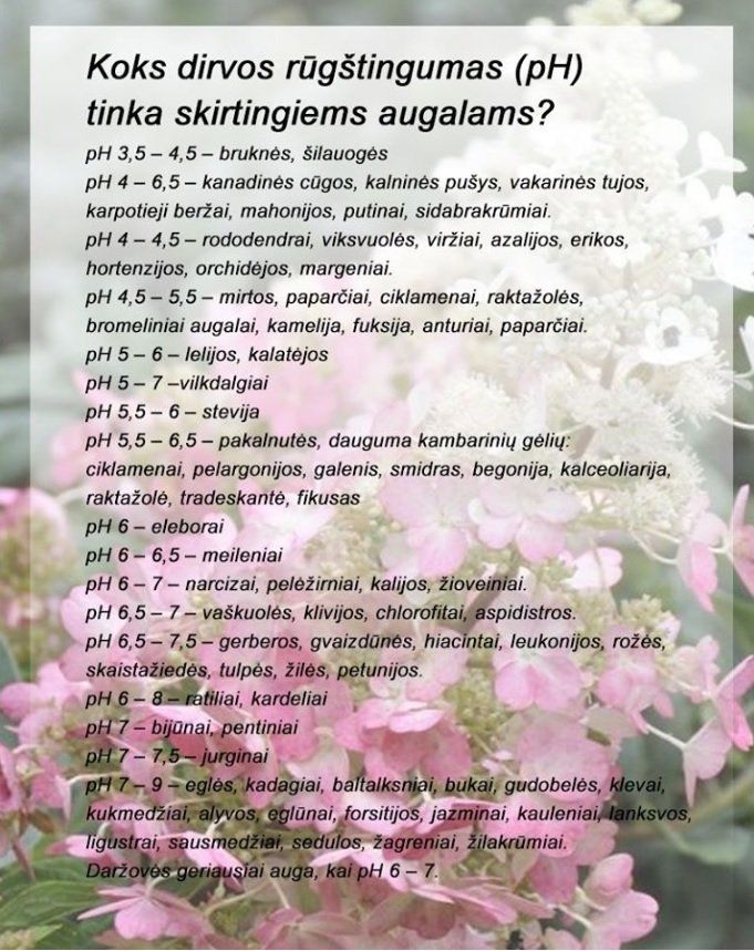 - pH 4 – 4,5 – rododendrai, mėlynės, viksvuolės, viržiai, azalijos, erikos, hortenzijos, margeniai.