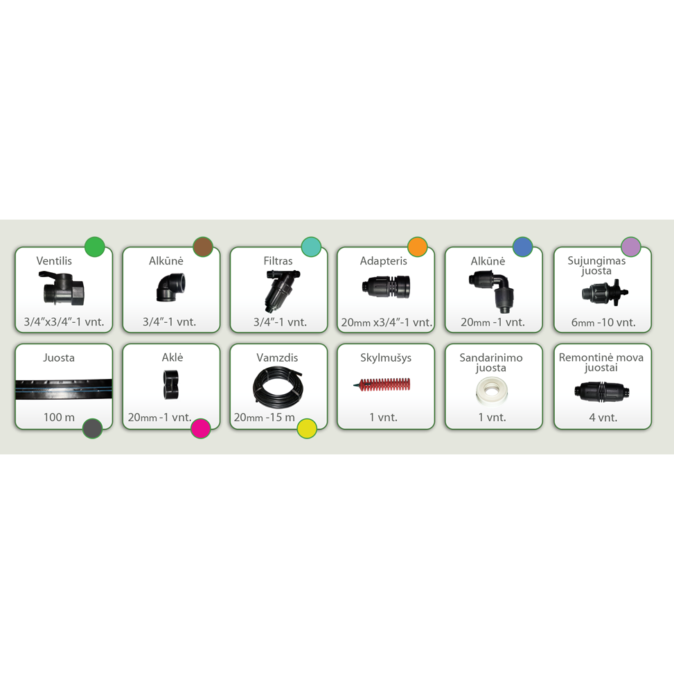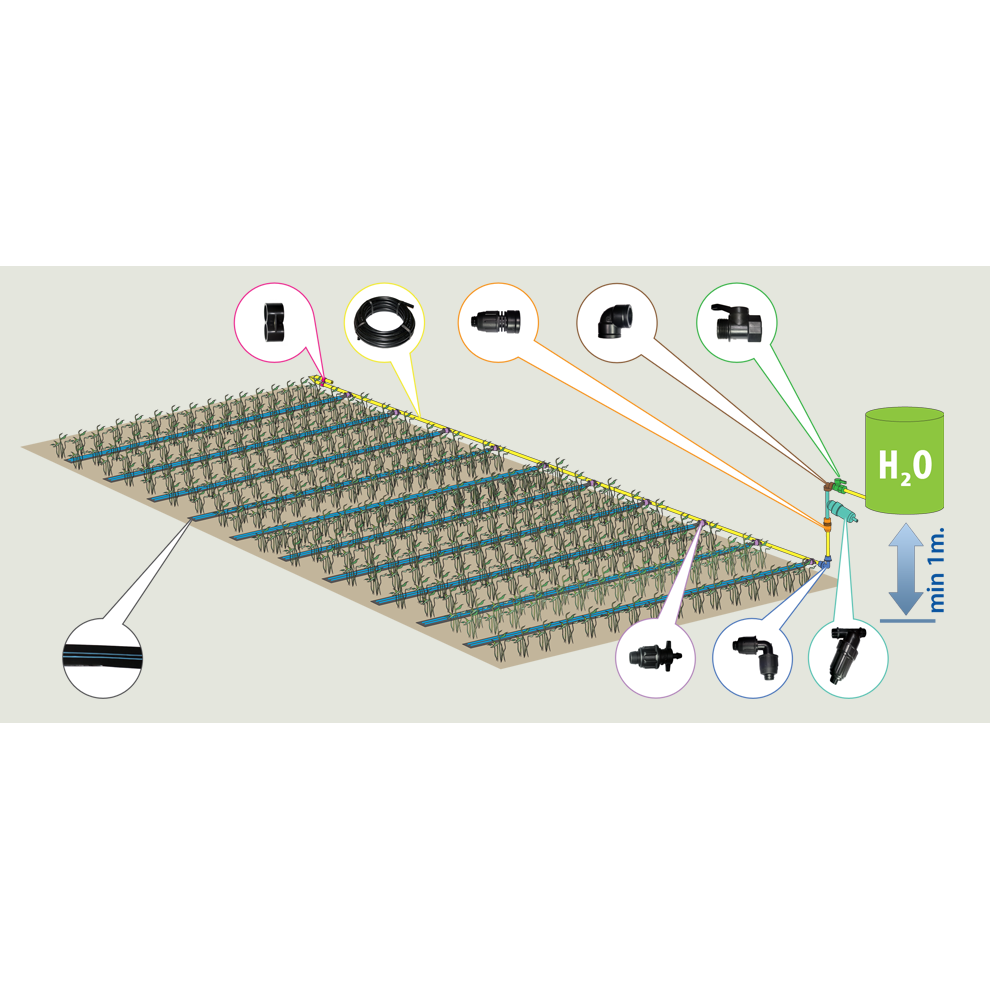 Tai naujas, iš karto tinkamas naudoti lašelinės drėkinimo sistemos rinkinys, kuris suteikia galimybę tolygiai paskirstyti vandenį bei maistingąsias medžiagas prie kiekvieno augalo šaknų. Taip didėja ir augalų kokybė ir jų derlius. Rinkinį paprastai įdiegti, naudoti ir prižiūrėti jokių specialių įgūdžių laistymo sistemų srityje neturinčiam žmogui, jam nereikia nei vandens slėgio, nei elektros energijos.