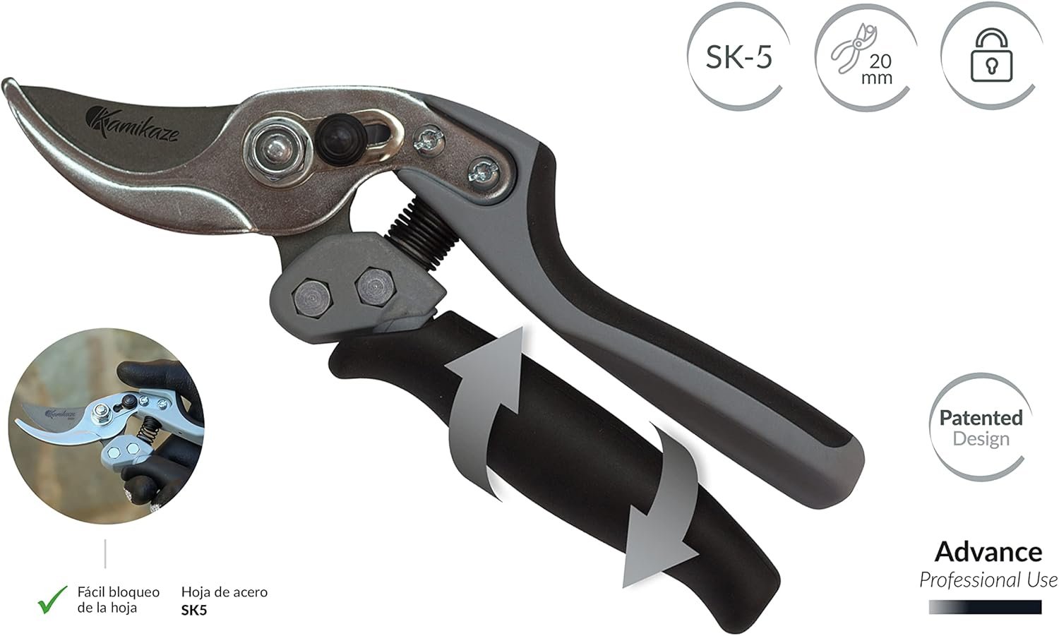 JAPONIŠKAS SK-5 GRŪDINTAS PLIENAS: Ašmenys pagaminti iš karštai kalto ir grūdinto aukštos kokybės japoniško SK5 plieno. Dėl didelio anglies kiekio SK5 plienas pasižymi puikiu kietumu ir atsparumu dėvėjimuisi. Šis plienas gerai išlaiko aštrumą. Lengvai nupjaukite iki 20mm skersmens šakas. Šis sodo sekatorius leidžia pjauti įvairių rūšių augalus, medžius ir krūmus.