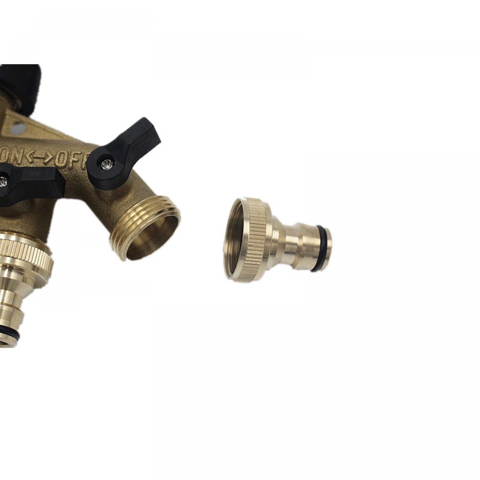 Aukštos kokybės žalvarinis ventilis. Keturi šio sujungimo vožtuvai leidžia prie vieno vandens šaltinio prijungti keturias atskiras laistymo linijas.